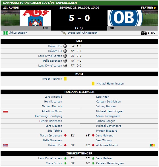 Hans bedste kamp i superligaen gennem tiden, må være for AGF, da holdet vandt stort over (desværre) OB. Lars Larsen skiftes ind efter 62 minutters spil, hvor han afløser landsholdsspiller Martin Jørgensen og scorer to gange. (Billede er 'PrintScreen' fra www.danskfodbold.com)