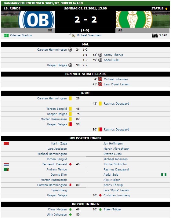 Jeg (Brian Dam) kan huske jeg overværede superligakamp i Odense mellem OB og AB i 2001. Kampen bar præg af en ringe dommerpræstation, som sluttede 2-2. Heldigt for OB var, at AB brændte hele to straffespark, hvor Lars Larsen brændte det andet af de to. (Billede fra www.danskfodbold.com)